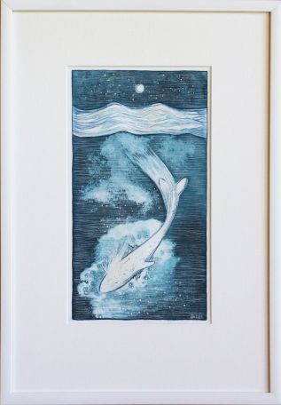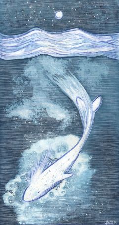 Taiteilijan sanat: Valaat ovat inspiroineet useampiakin teoksiani. Eräänkin valasmaalauksen olen myynyt Tromssaan, Norjaan; sinne, missä voi oikeastikin nähdä valaita. Merten tummassa syvyydessä, missä nämä viisaat esi-isämme sukeltelevat, on hyvin paljon samankaltaista mystisyyttä kuin avaruudessa. Edelleen aika vähän ihmiskunta tietää mitä kaikkea merten tai avaruuden syvyyksissä tapahtuukaan.